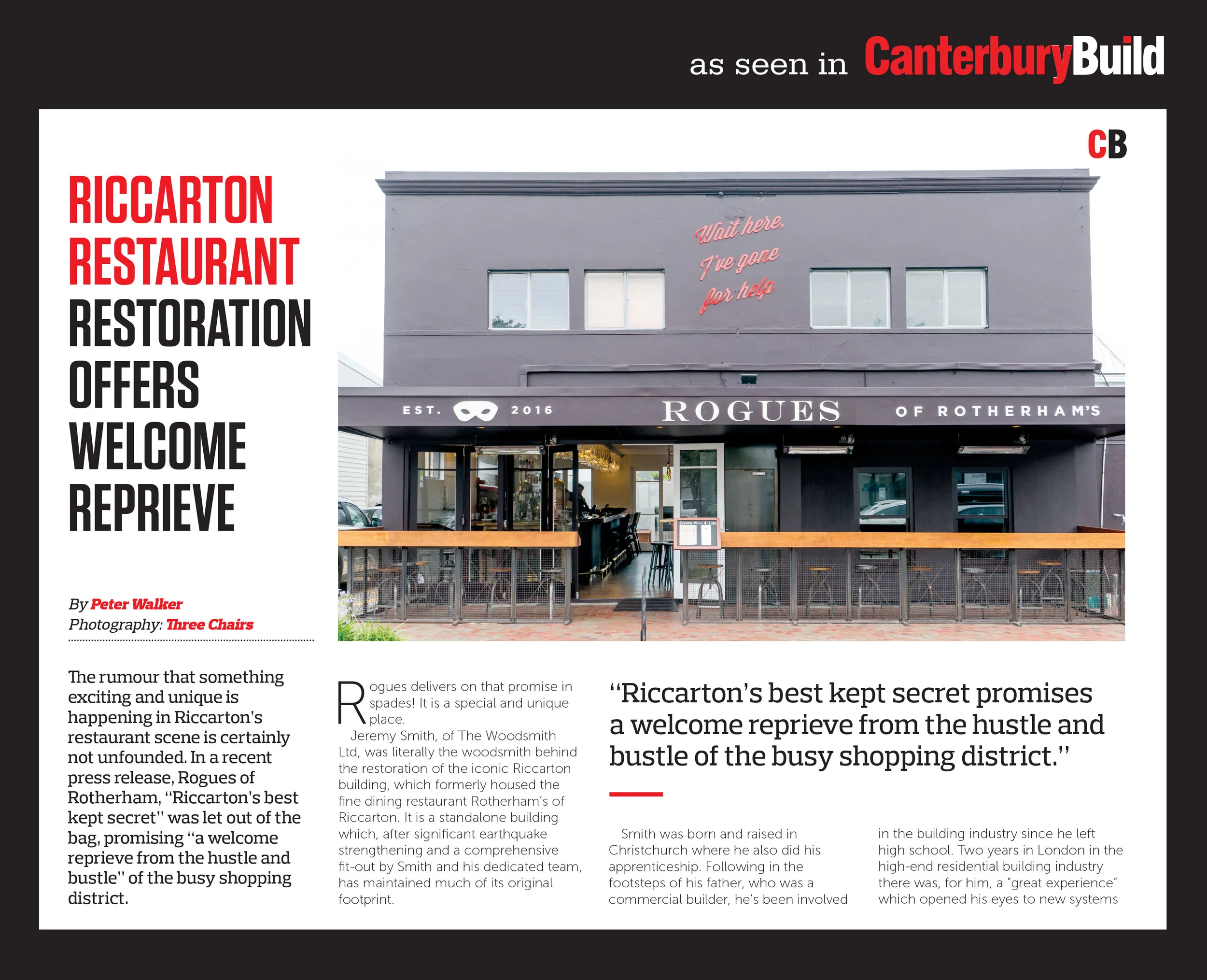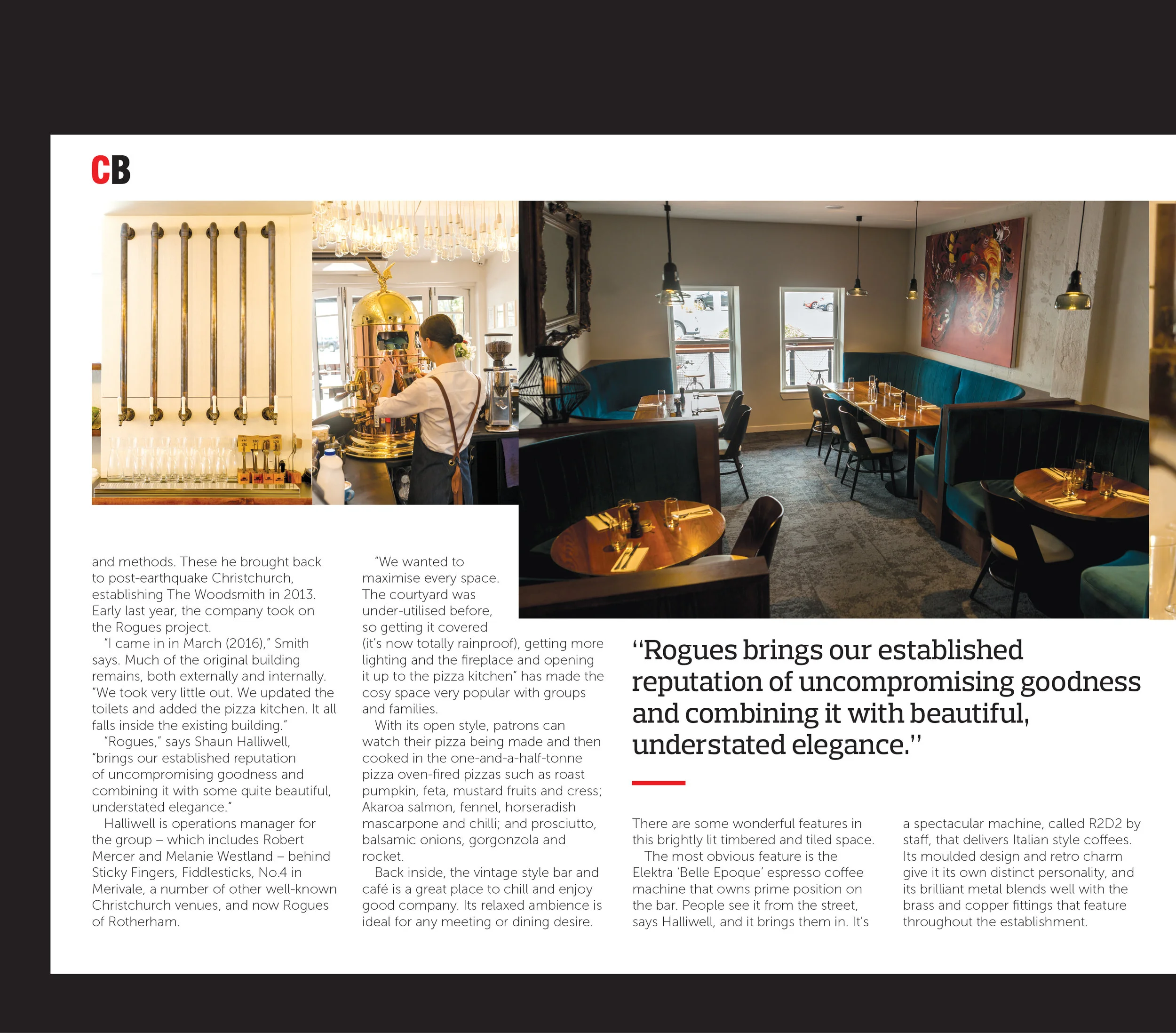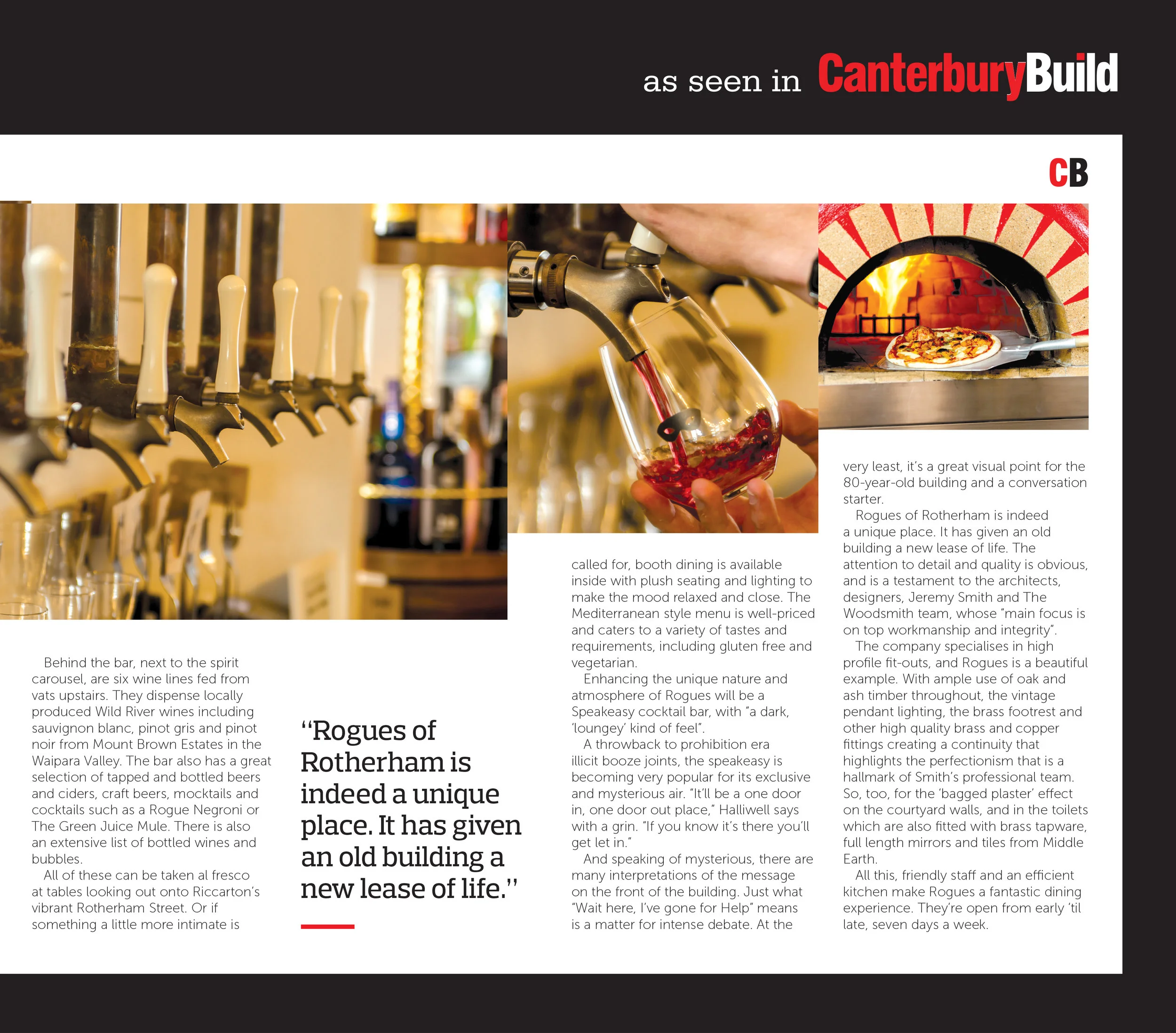 Rogues of Rotherham is indeed a unique place. It has given an old building a new lease of life. The attention to detail and quality is obvious, and is a testament to the architects, designers, Jeremy Smith and The Woodsmith team, whose “main focus is on top workmanship and integrity”. The company specialises in high profile fit-outs, and Rogues is a beautiful example. With ample use of oak and ash timber throughout, the vintage pendant lighting, the brass footrest and other high quality brass and copper fittings creating a continuity that highlights the perfectionism that is a hallmark of Smith’s professional team.